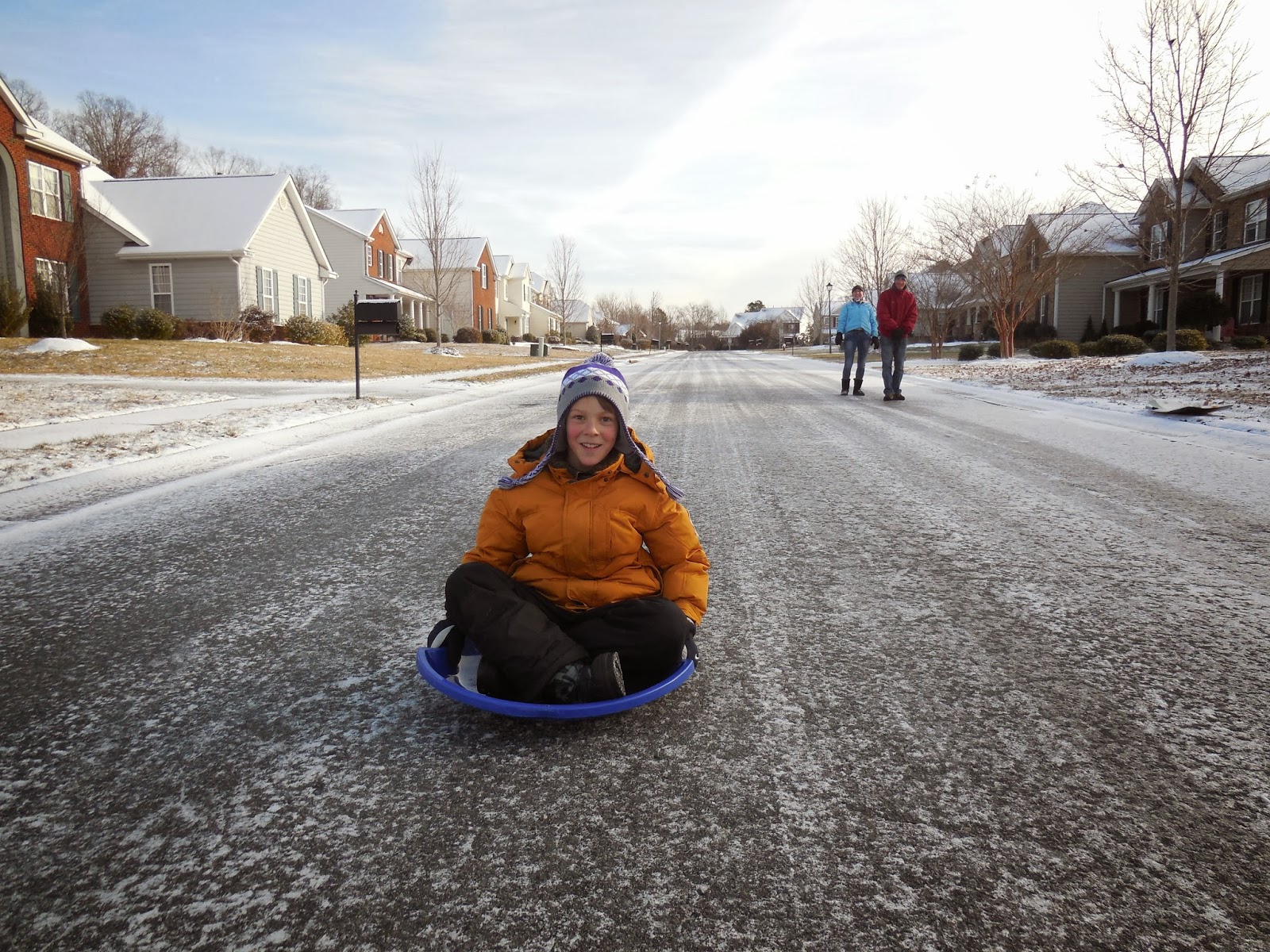 The hill in our neighborhood just didn't have enough snow to sled down so in the southern way of sledding, we took to the streets and rode down the street that was a sheet of ice!